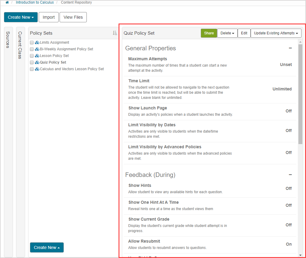 NOTE: A read-only preview of your selected Policy Set is also displayed when you are editing an activity in an Activity Editor. In the 2. Set Properties tab of the Lesson Editor or the 3. Set Properties tab of the Assignment Editor, you can navigate to the Policy Set pane and select a Policy Set to apply to the specific activity that you are editing. After selecting a Policy Set from the provided drop-down, a read-only summary of the selected Policy Set is displayed.