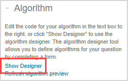 The Show Designer and Hide Designer buttons function the same in the Lesson or Assignment Editors, but are located below the Algorithm Editor.