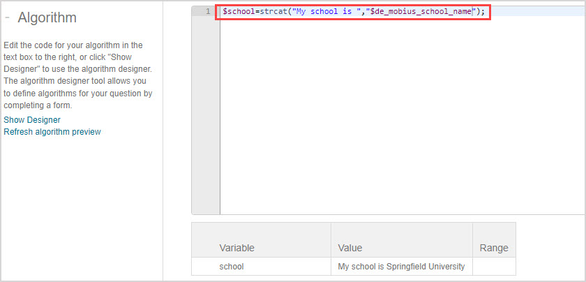 • $de_mobius_school_name — Returns the name of the current Möbius site, as seen in the title bar of your browser tab or on the login page.