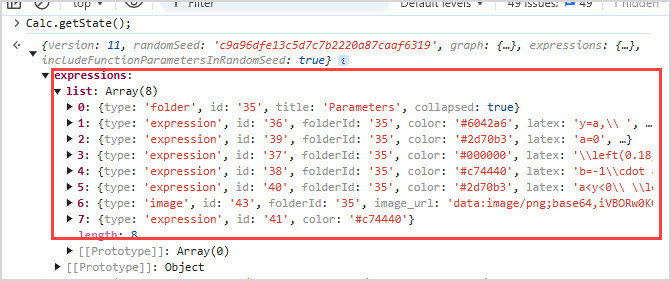 Calc.getState();Expand the output and note all the expression names and id values (note in particular the id of the expression with the correct answer).