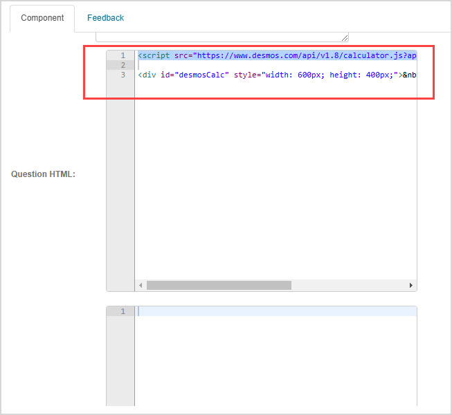 Enter the following Question HTML, where API_URL is the Desmos API URL with API Key value for your Desmos app: