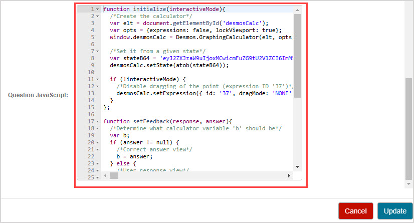 };NOTE: The last part of the initialize() function above (referencing SLIDER_ID) is for disabling any interaction with the Desmos app in the Möbius question feedback or the Gradebook. Each slider or other interactive expression in the Desmos app should be disabled by calling the appropriate Desmos API method (referencing the id value of that expression from Step 3).