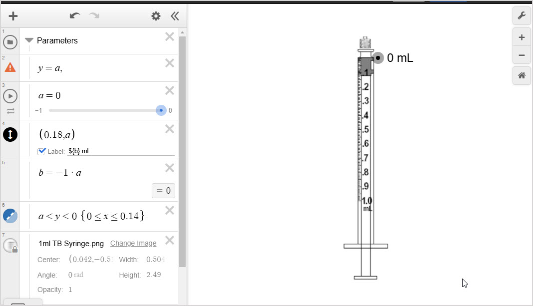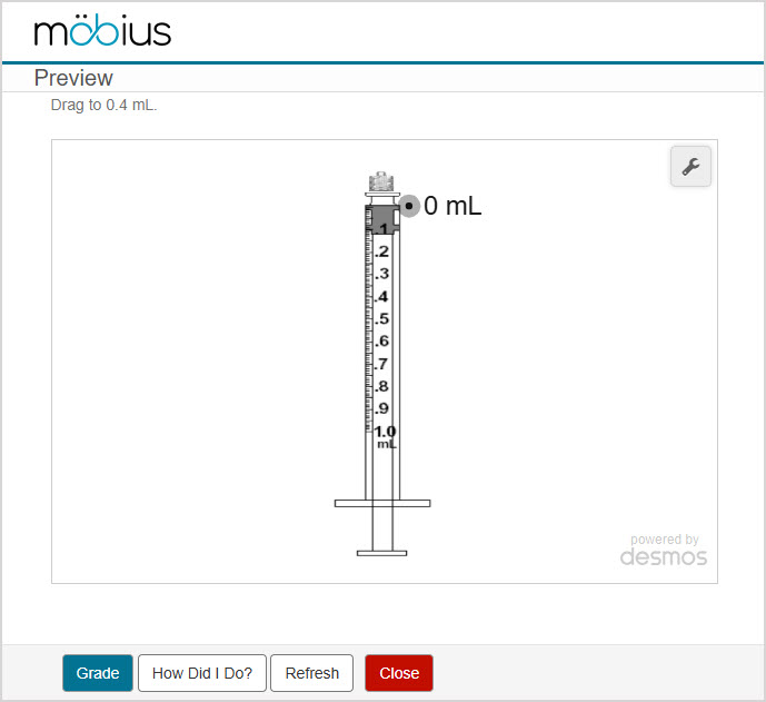 The Desmos app embedded in Möbius is "1 mL Syringe (With mL Label)" by Daniel Ozimek, used under CC BY-SA 4.0.