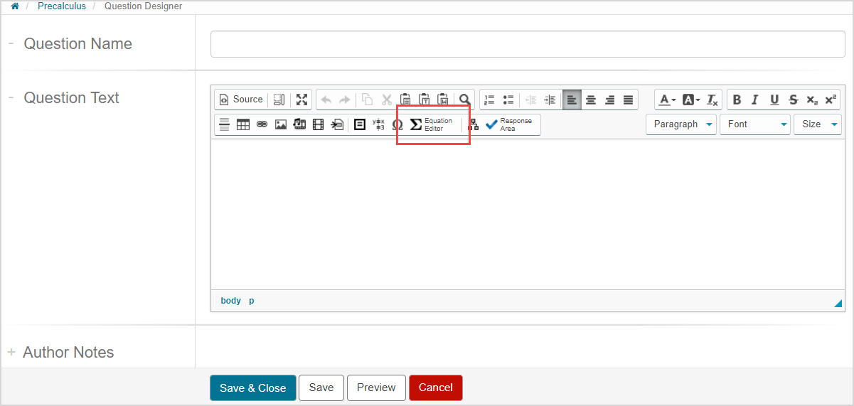 You can access the Equation Editor from most authoring areas of Möbius where the Visual Editor is found while authoring items such as: