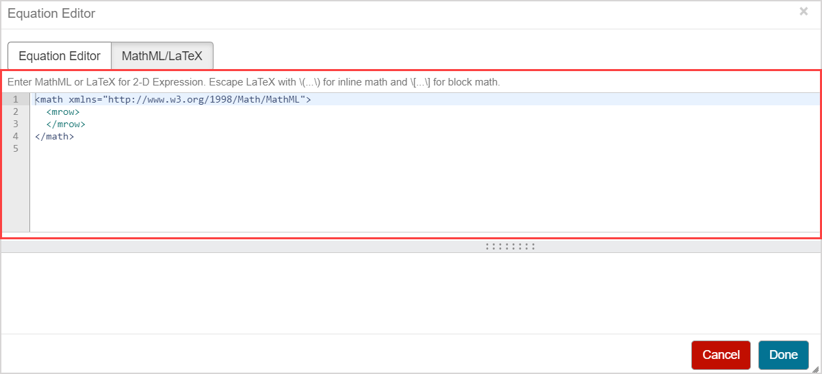 NOTE: A preview is displayed below the text field based on your MathML or LaTeX code.