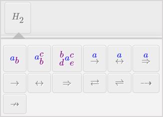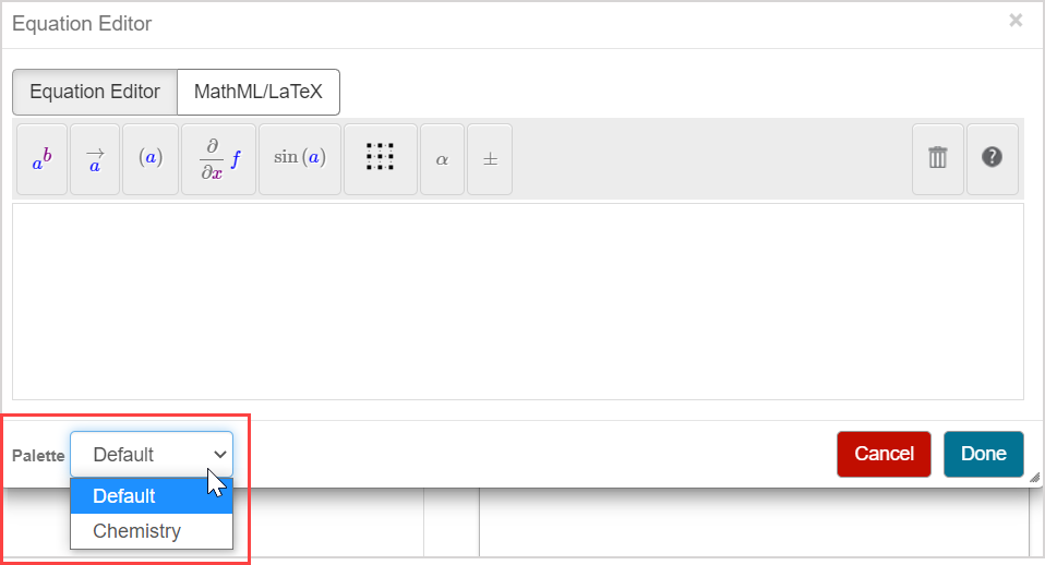 NOTE: The palettes that are available in the student Equation Editor are determined by the type of question you've authored. Example — Here are the student Equation Editors if you've authored a (A) formula sub-type of the mathematical formula question or a (B) chemical equation sub-type of the mathematical formula question: