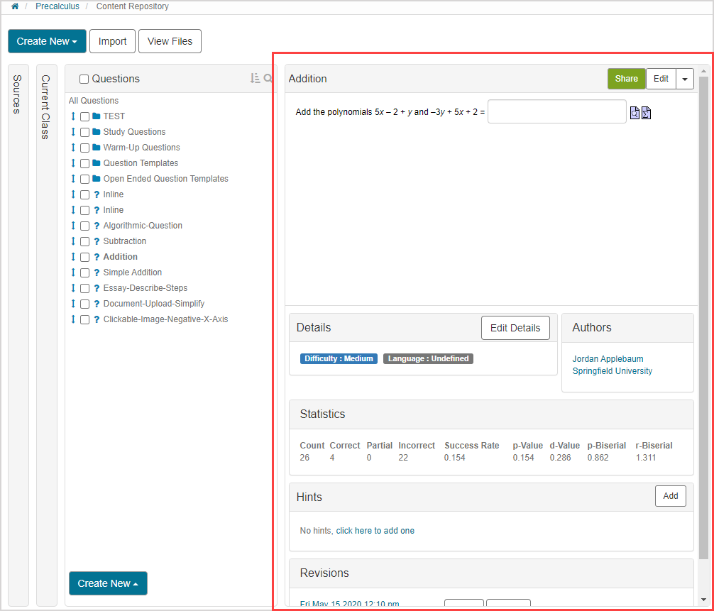 Your new hint is now listed in your defined order in the Hints pane of the Content Summary pane for the question. Your hint will be included with the question wherever the question is used.