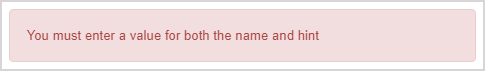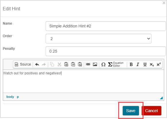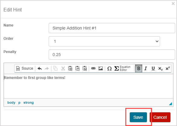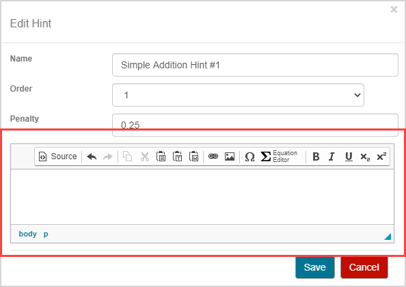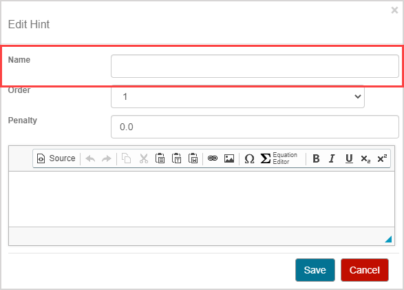 NOTE: A hint must have defined name and content to be saved to the question. An error appears if either of these fields are empty.