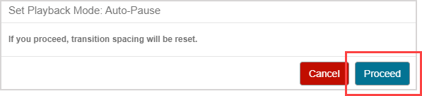 NOTE: If you've added transitions in Set Duration or Play Audio mode, your transition marker spacing will be irreversibly overridden if you change to the Auto-Pause mode. Click Proceed to allow the spacing override to the pre-defined transition marker spacing of Auto-Pause mode.