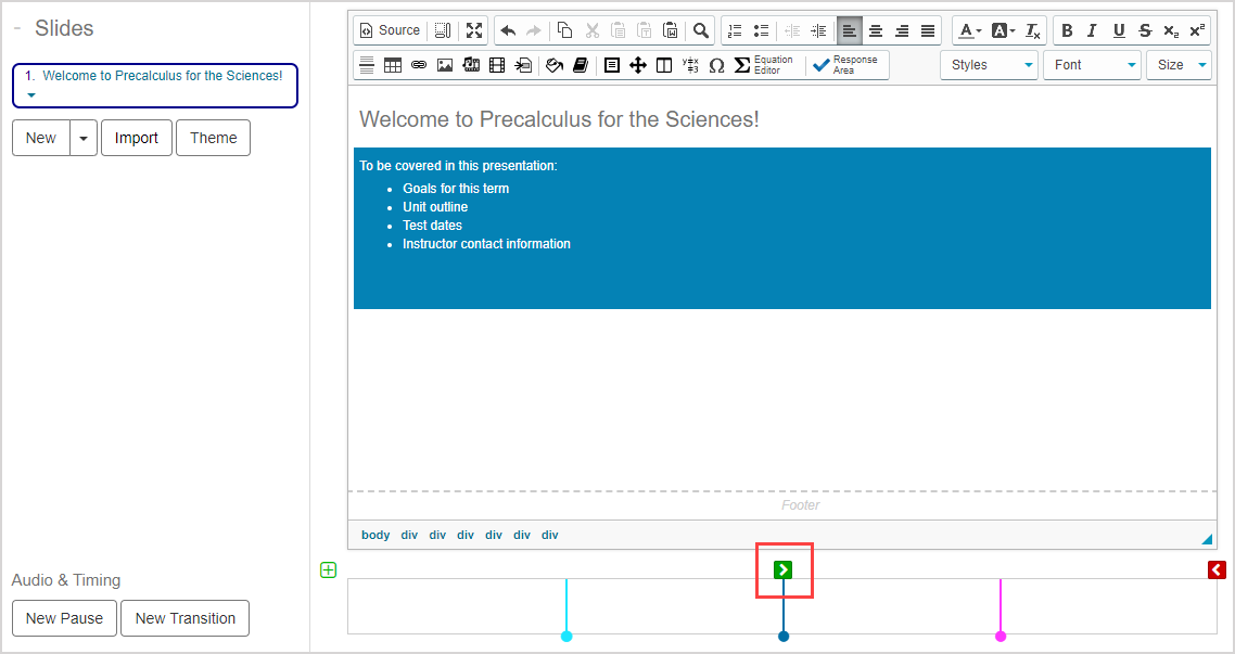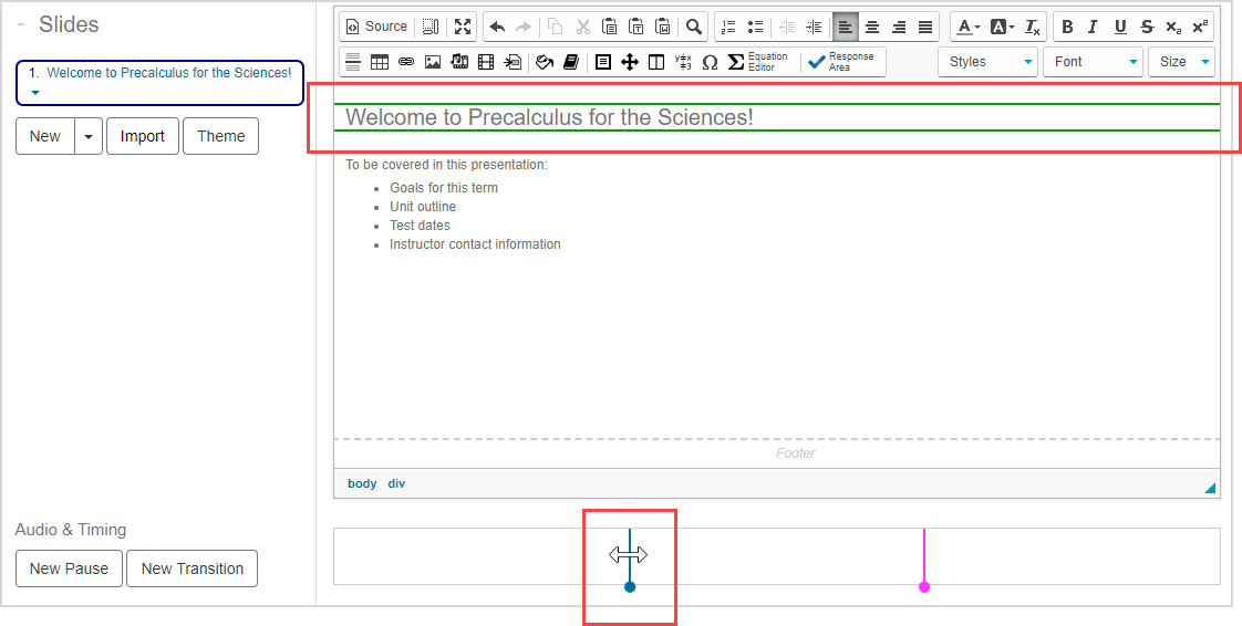 NOTE: Transition marker placeholders can't be repositioned if your slide is authored using the Auto-Pause playback mode.