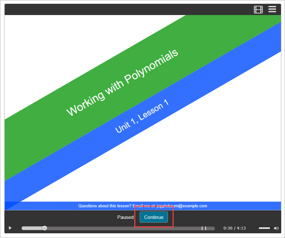 NOTE: When the pause marker is reached while a student is viewing the interactive narrative, the presentation will rest. The student can click Continue to resume the presentation.