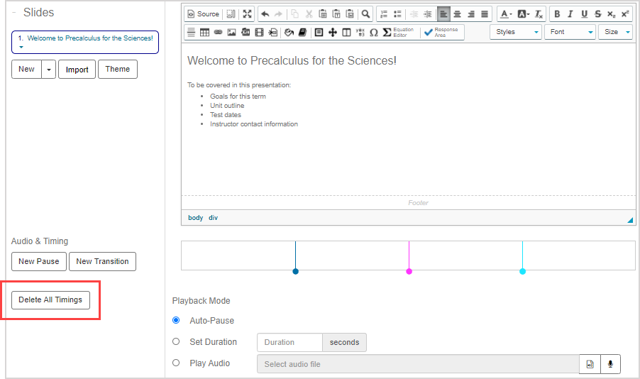 - Click Delete All Timings (and then Yes) on the slide editing page to erase all transition markers from the waveform bar.