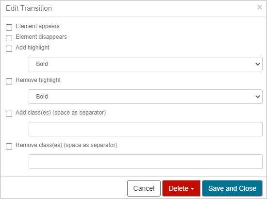 - Remove class(es) — Select the check box and specify a CSS class to be removed from a slide element (use a space as a separator within your CSS).