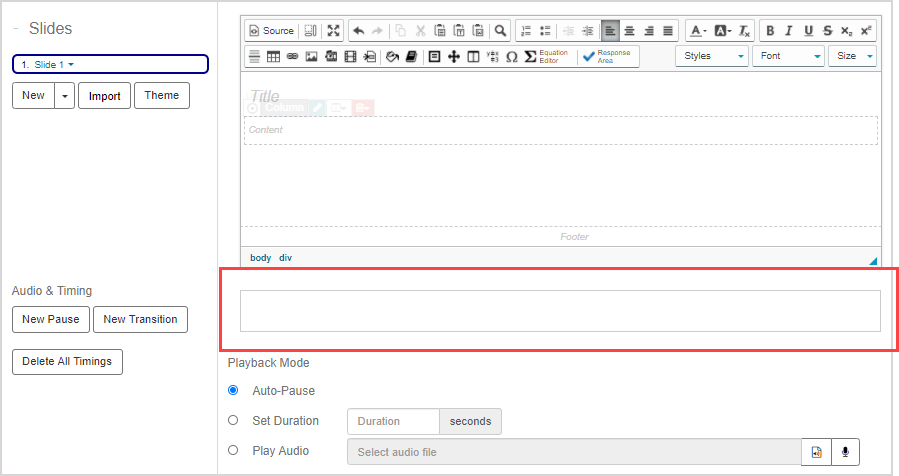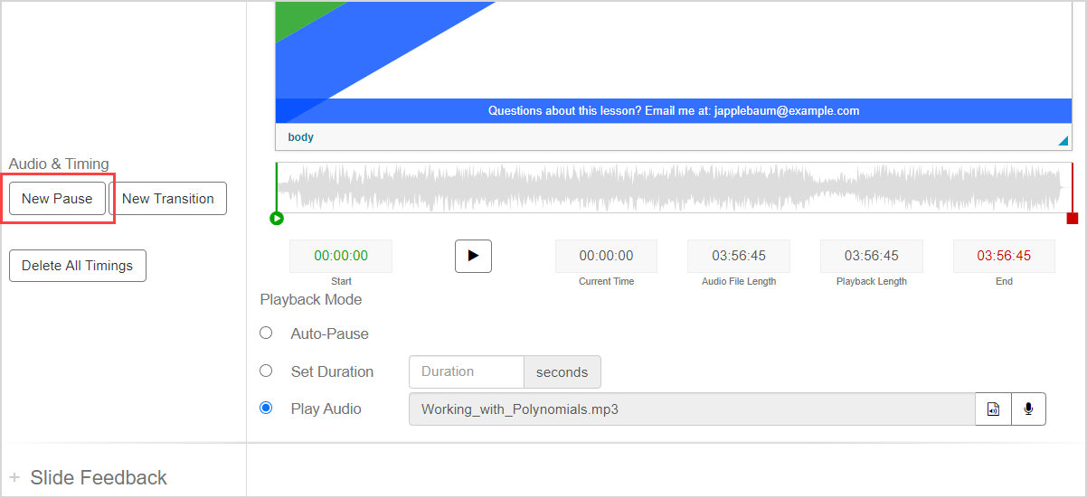 NOTE: Pauses have no effect on slides authored with the Auto-Pause playback mode.