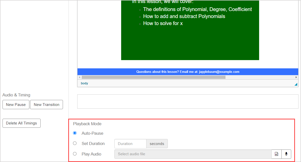 - Play Audio — Upload or record an audio file to accompany your slide.