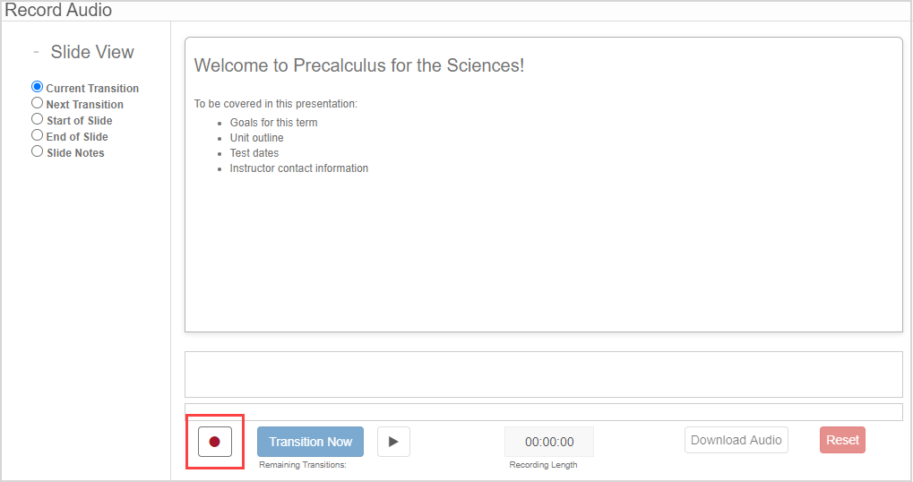 Click Record on the Record Audio page to start the recording for the selected slide.