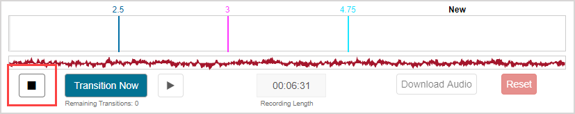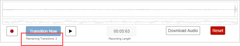 Click Transition Now during your recording to insert a transition marker placeholder into the waveform bar on the Record Audio page.