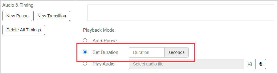 - Set Duration — Define the number of seconds that the slide displays for before automatically transitioning to the next slide.