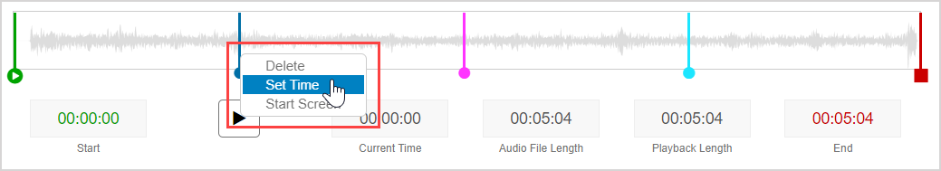 - Right-click on a marker (Example — transition marker, pause marker) in the waveform bar and click Set Time to fine-tune the time stamp of the marker.