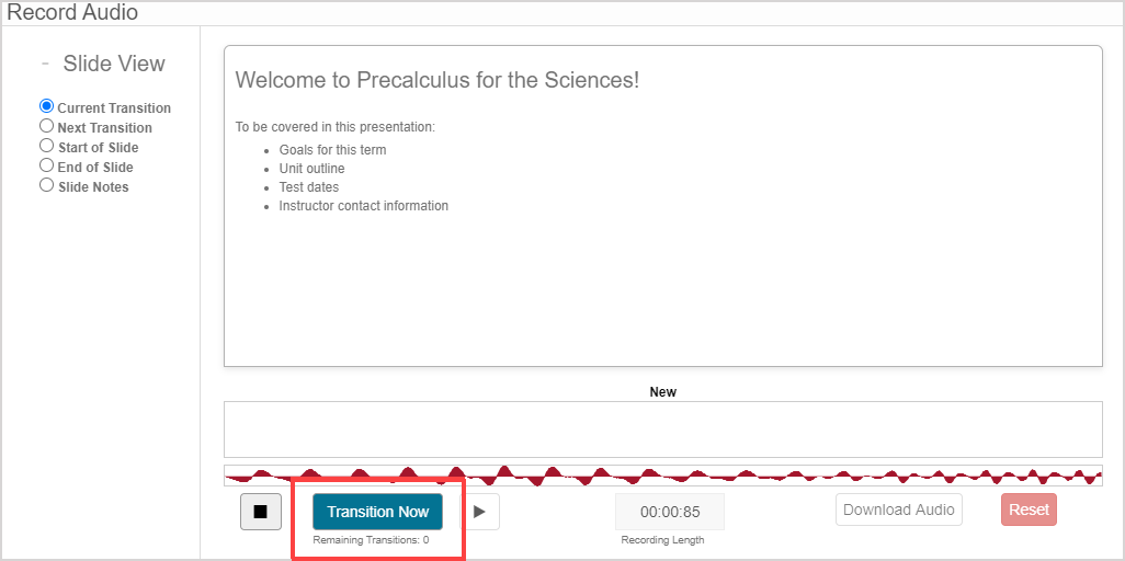 NOTE: Any transition markers that you've previously inserted from the slide editing page will appear in the waveform bar while you're recording audio and are summarized in the Remaining Transitions field.