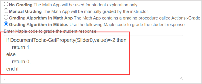 You can author a Math App question to use grading code that you define within Möbius's Question Editor to grade student responses to Math App questions.