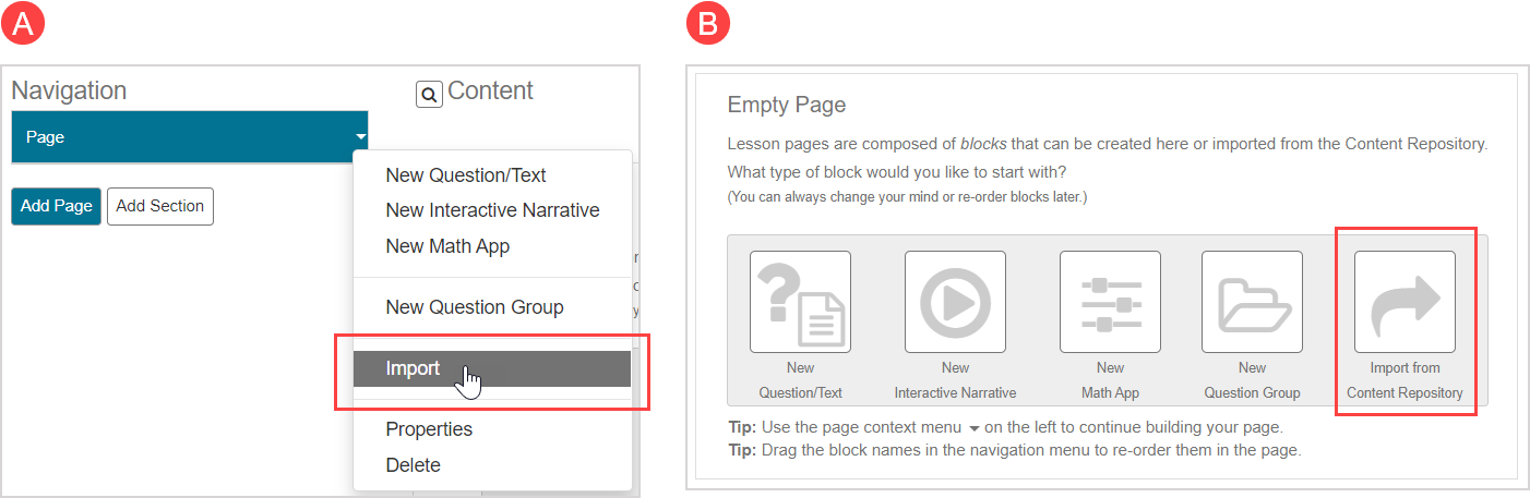 Click (A) Import or (B) Import from Content Repository.