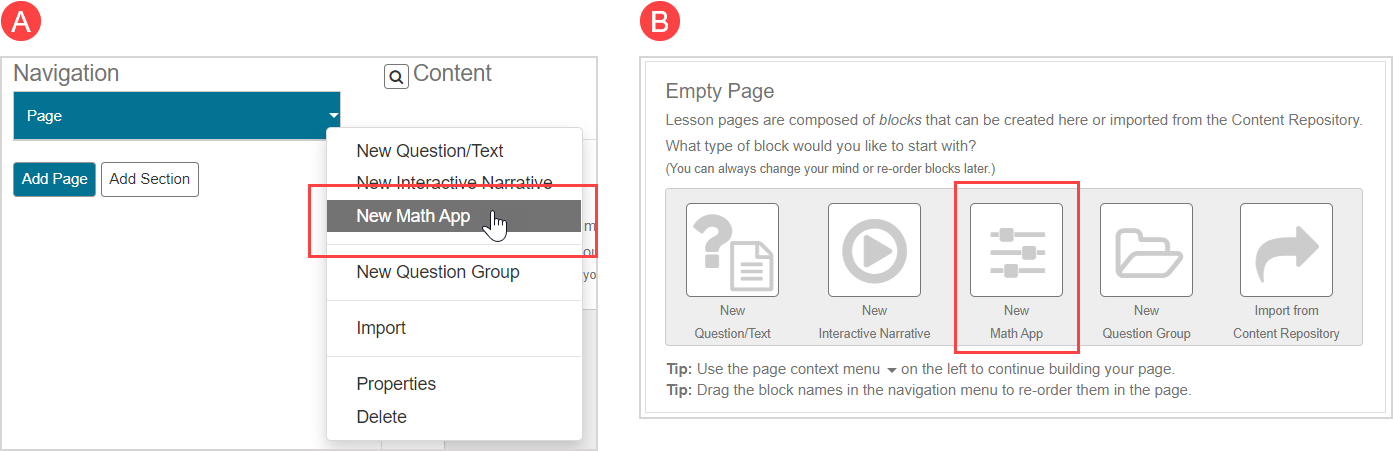Click New Question from the (A) Add Questions pane or (B) Add drop-down list (if content already exists in your assignment) to author a new question that contains an exploratory ungraded Math App.