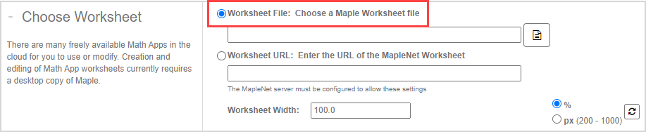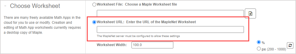 - If you have access to a MapleNet server, select the Worksheet URL option and enter the MapleNet URL of your Math App worksheet.