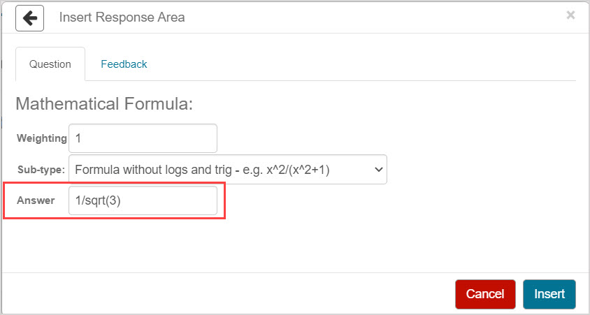 NOTE: The answer must use the correct syntax for the selected sub-type. Example — sin can't be included in the correct answer if you're authoring a formula without logs and trig question sub-type.