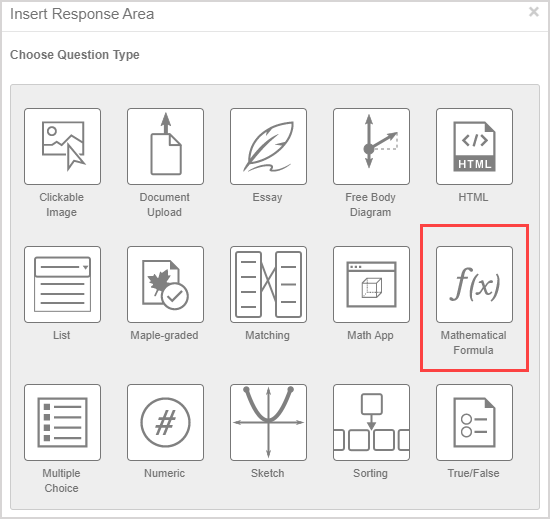 There are ten sub-types of mathematical formula questions that accept specific types of responses.