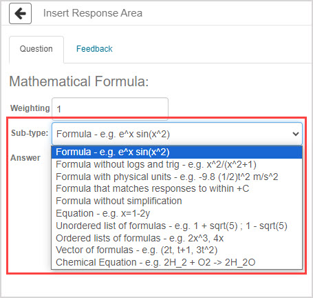 Select the sub-type of mathematical formula question that you want to author from the Sub-type drop-down list.