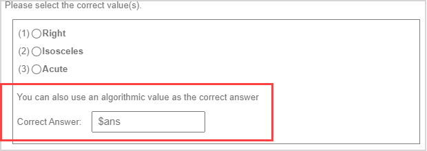 TIP: Alternatively, you can use an algorithmic variable in the Correct Answer field.