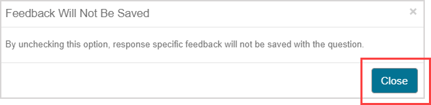 NOTE: If you deselect the Use Response Specific Feedback check box after authoring your feedback, a warning message is displayed stating that your authored feedback won't be saved. Click Close to continue.