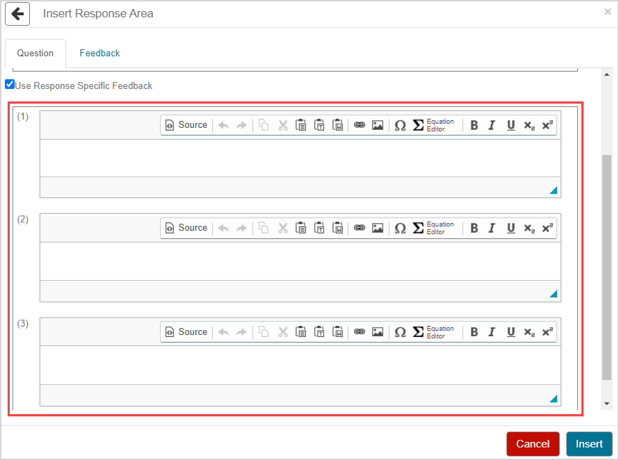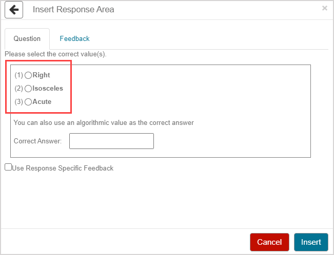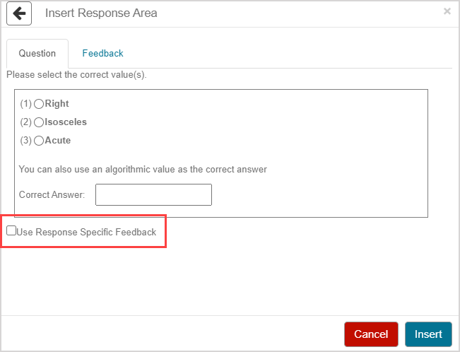 (Optional) Select the Use Response Specific Feedback check box to author feedback that's specific to each answer choice.