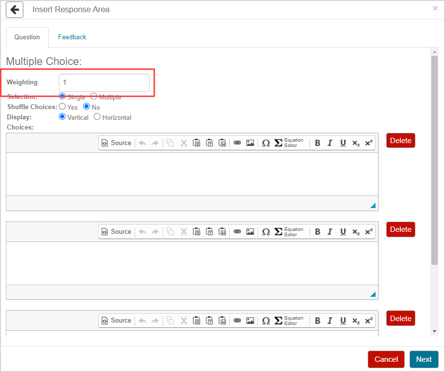 TIP: The weight of the component can be any integer greater than 0, and is calculated proportionate to the total of all weights across the question. Example — A question with two components could have the first weighted as 2, and the second weighted as 4. This means that the second component will be worth twice as much as the first when calculating the total grade for the question.