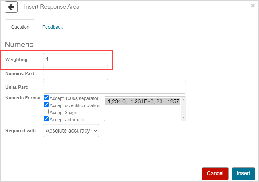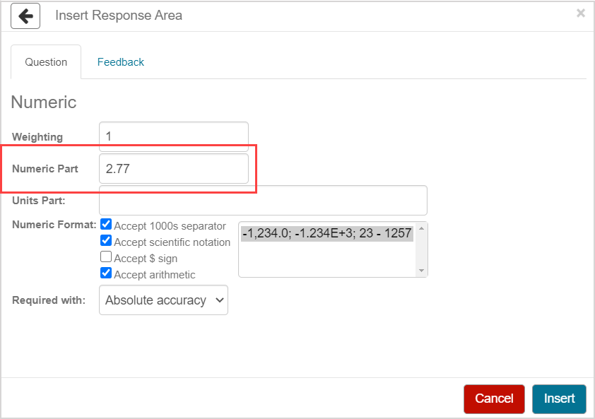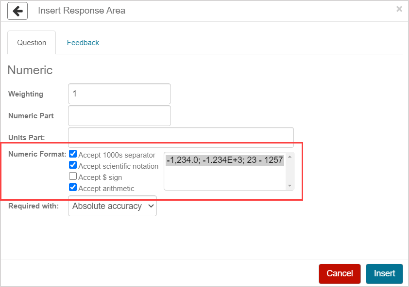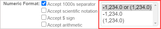 | Accept arithmetic | 1230+4 | Arithmetic operators (Example — +, -, *, /, (), and ^) are accepted in student responses. Selected by default. TIP: If your correct answer includes arithmetic, ensure that the Accept arithmetic numeric format is enabled. Example — If your answer is 1/3 and Accept arithmetic is disabled, students won't be able to submit a correct answer of 1/3. NOTE: Parentheses can't be accepted to indicate negative values if the Accept arithmetic numeric format is enabled. |