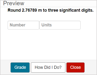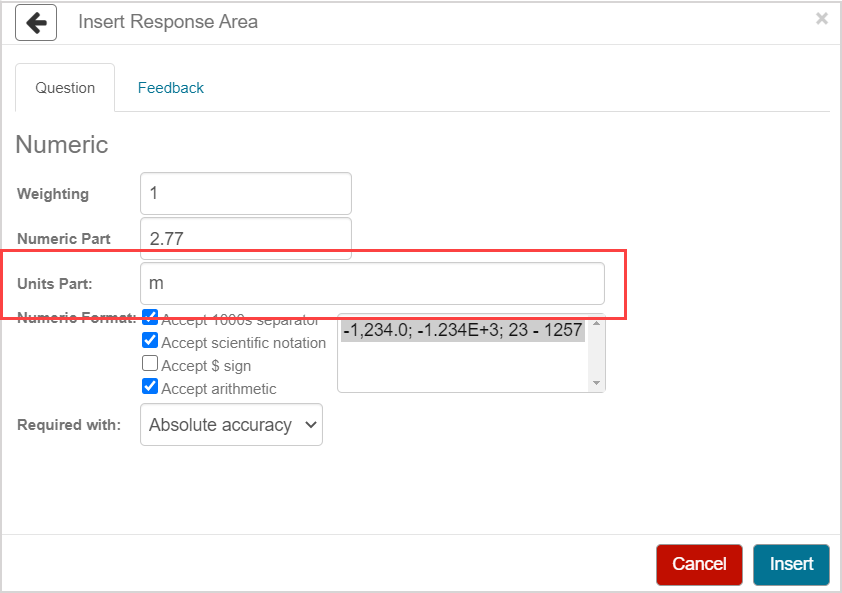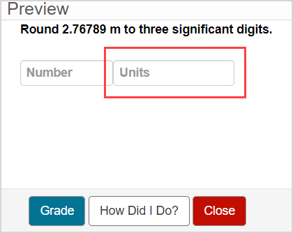 NOTE: The Units field will be visible to students indicating that a unit of measure is required in their response if you've entered a value in the Units Part field during question authoring.