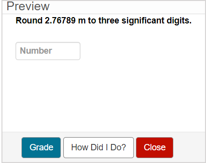 IMPORTANT: Your defined correct answer in the Numeric Part field should have the same number of significant figures as defined by the Set # figures grading property. Example — If the correct answer is 123.4, then 4 should be the value entered in the # figures field. NOTE: A partial grade of 50% is awarded if the Set # figures grading property is defined and a student's response is mathematically correct but contains the incorrect number of significant figures. NOTE: The Set # figures grading property can't be paired with the Accept arithmetic numeric format. TIP: When working with the Set # figures grading property and algorithms, it's recommended that you use the sig algorithmic function to create algorithmic variables. By using these variables in the question statement, feedback, hints, and answer, you ensure that values are displayed with the correct number of significant digits. Check out View available functions for algorithmic questions. |