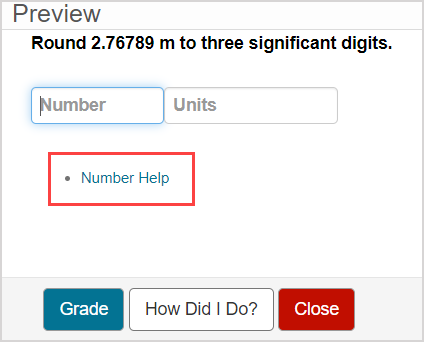 NOTE: Students are provided with a Number Help link within the question based on the selections you make from the Numeric Format field during question authoring. Students can click within the Number answer field to reveal the Number Help link which contains details about the allowed numeric formats.