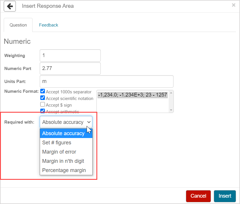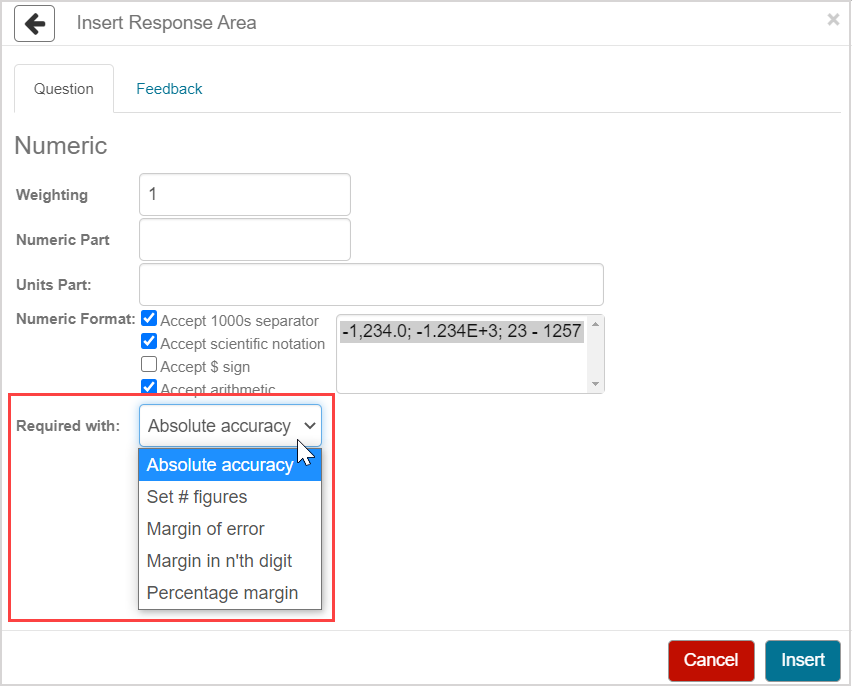 The options of the Required with drop-down menu allow you to define the accepted accuracy and allowed tolerance of student responses for your question: