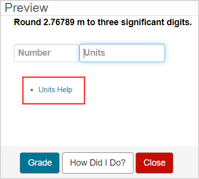 Students are provided with a Units Help link within the question if you've entered a value in the Units Part field during question authoring. Students can click within the Units answer field to reveal the Units Help link which contains details about the allowed units of measure and their equivalents.