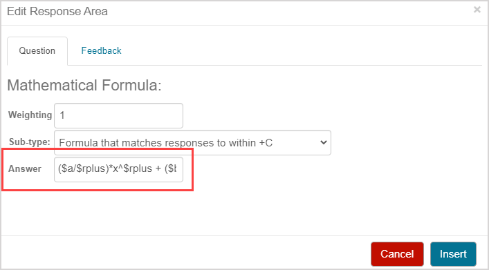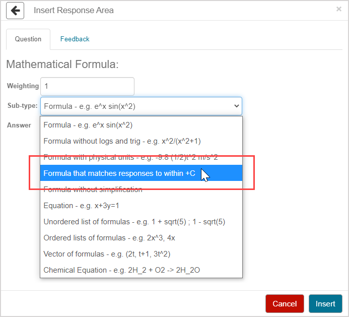 This sub-type is authored by selecting the Formula that matches responses to within +C option from the Sub-type drop-down list during mathematical formula question authoring.