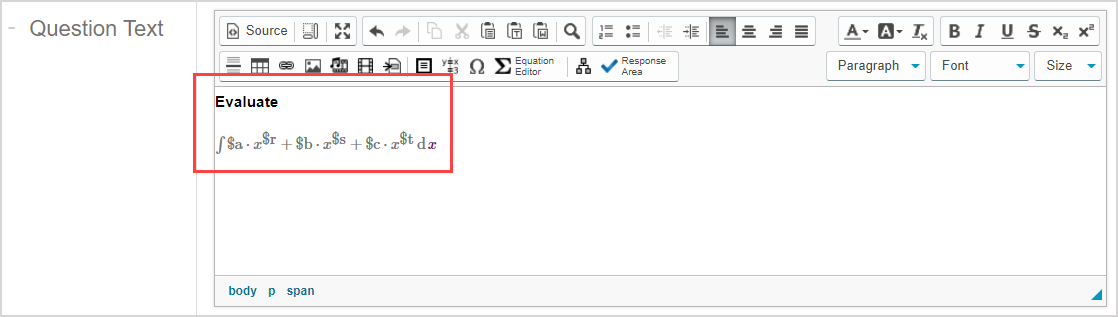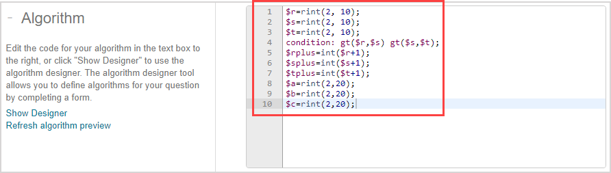 NOTE: The dollar sign ($) character can only be used in mathematical formula questions when it's a part of a variable name. Be sure to define algorithmic variables in the Algorithm pane in order to use them in the Answer field.