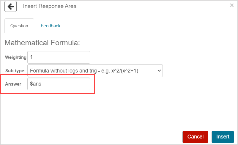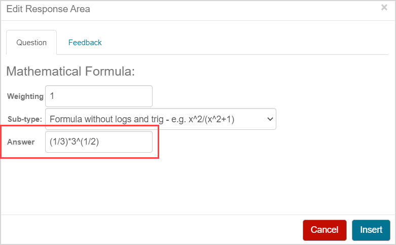 This sub-type is authored by selecting the Formula without logs and trig option from the Sub-type drop-down list during mathematical formula question authoring.