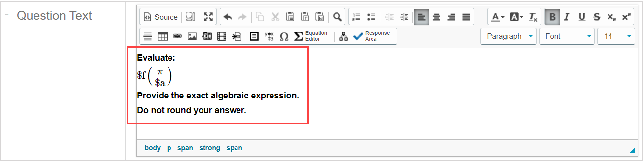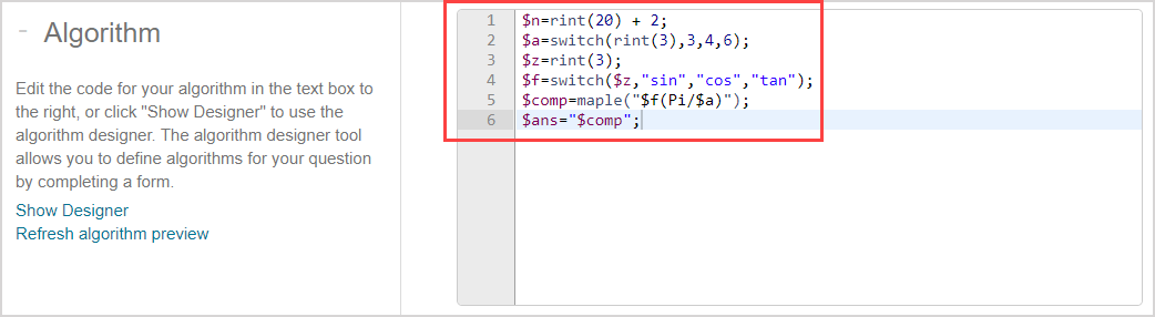 NOTE: The dollar sign ($) character can only be used in mathematical formula questions when it's a part of a variable name. Be sure to define algorithmic variables in the Algorithm pane in order to use them in the Answer field.