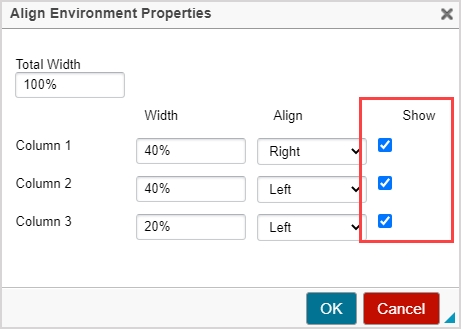 - Show check box is selected — You can input text and media, and the column's contents are visible when previewed or viewed.