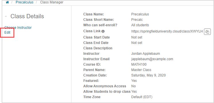 The details and settings of an existing class or child class can be edited at anytime from the Class Homepage.