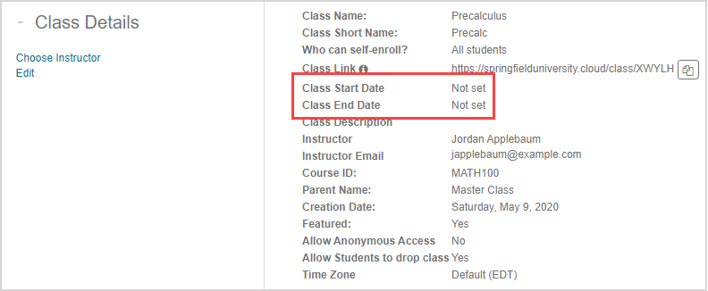 NOTE:Not set is displayed on the Class Details summary page if you choose to leave these class dates undefined.