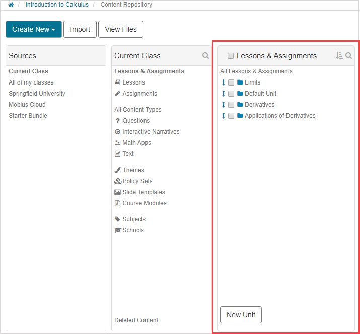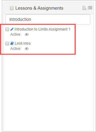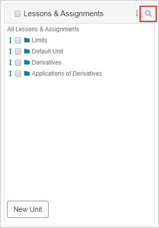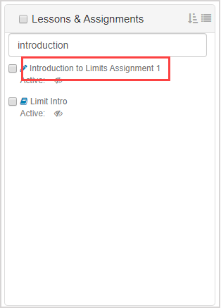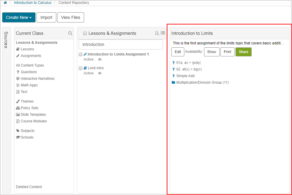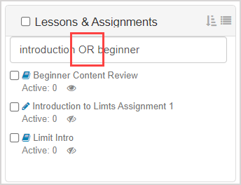You can search for specific content within the Content Repository (Example — assignments, lessons, questions, Math Apps, Course Modules, etc.).
