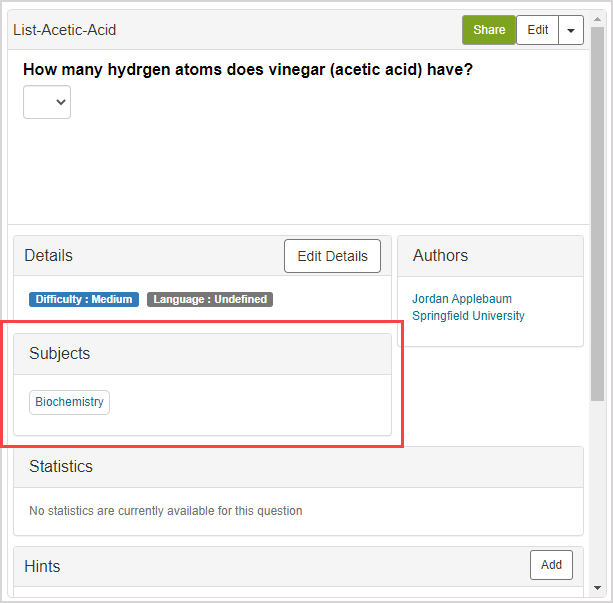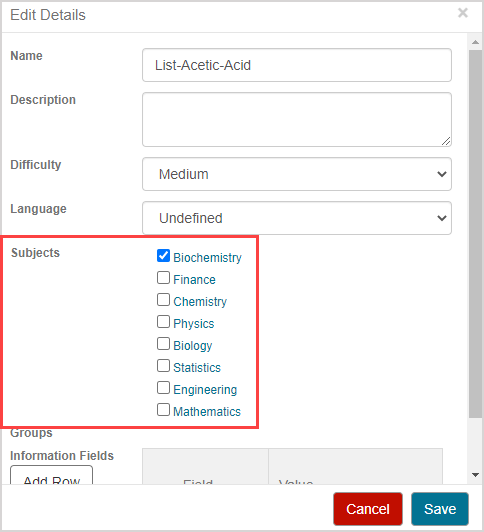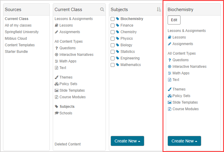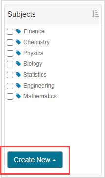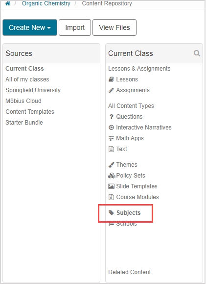 IMPORTANT: Changes that you make to a subject (Example — creating a subject, editing a subject name, etc.) will affect the subjects within your Content Repository as well as the Content Repositories of all other users across your Möbius site (Example — if you've created a new subject, all other users with access to a Content Repository within your organization will be able to interact with your subject in their class).